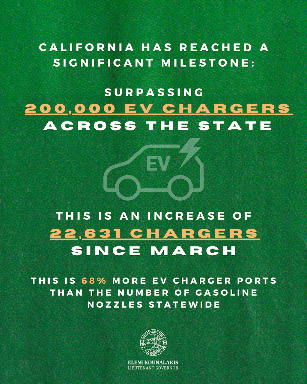 California surpassed 200,000 publicly available EV charging ports, more than the number of gas pumps statewide. Since March, we added over 22,600 chargers, and now 94% of Californians live within 10 minutes of an EV charger. This milestone demonstrates that electric vehicles are here to stay and that California is leading in clean energy innovation.